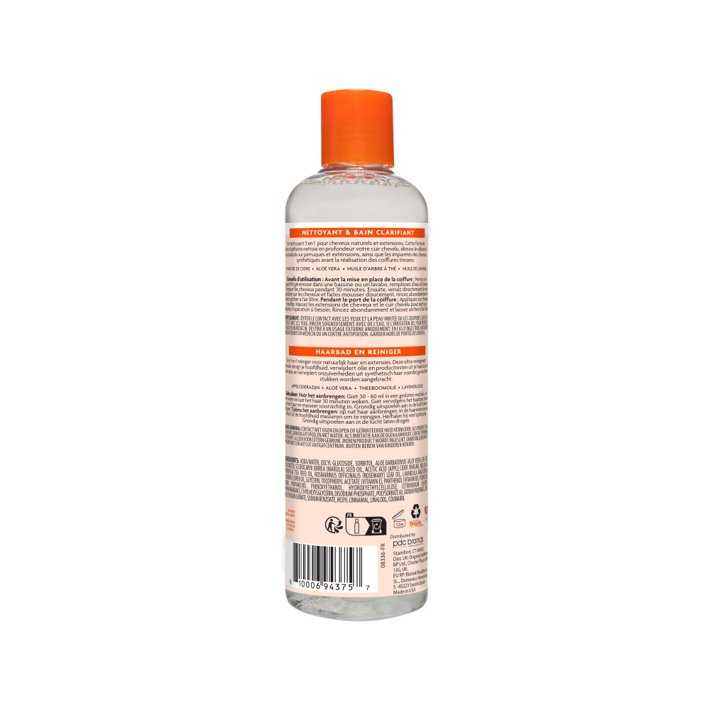 Un nettoyant 3 en 1 pour cheveux naturels et extensions. Cette formule ultra-clarifiante enrichie en arbre à thé, lavande et vinaigre de cidre nettoie en profondeur votre cuir chevelu, élimine le sébum et les produits issus de vos perruques et extensions, ainsi que les impuretés des cheveux synthétiques avant la réalisation des coiffures tressées.